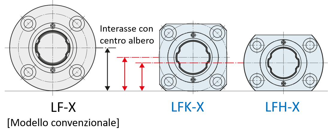 I modelli LFK-X e LFH-X sono progettati con un interasse tra il centro dell’albero e l’appoggio della flangia della chiocciola, inferiore rispetto al modello LF-X convenzionale. Ciò consente di realizzare un design più compatto.