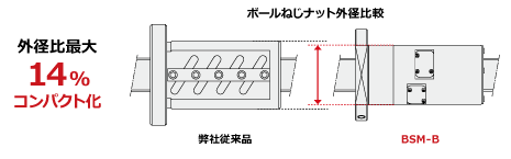 BSM-Bは弊社従来品と比べ、ナット外径をスリム化し、省スペース設計に貢献します。