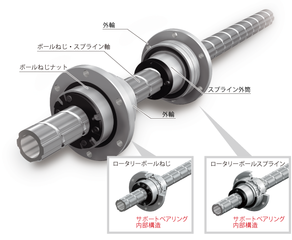 BNS-Vは、1本の軸にボールねじ溝とボールスプライン溝を設け、ボールねじナット、スプライン外筒の外周に専用のサポートベアリングをダイレクトに組み込んだ複合製品です。ボールねじナット、スプライン外筒を回転あるいは停止させることにより1軸で回転運動、直線運動およびスパイラル運動を得ることができます。
