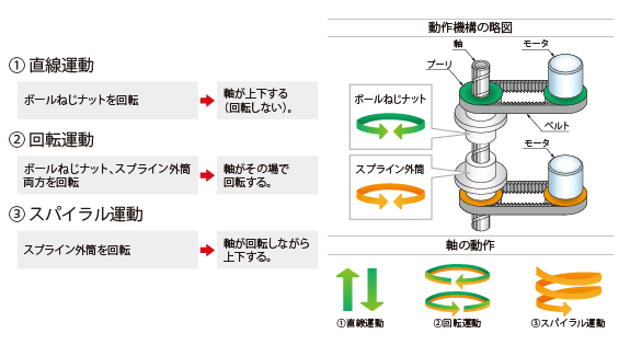 BNS-Vは、ボールねじナット、スプライン外筒を回転・停止させることにより、軸が1本で直線運動、回転運動、スパイラル運動します。